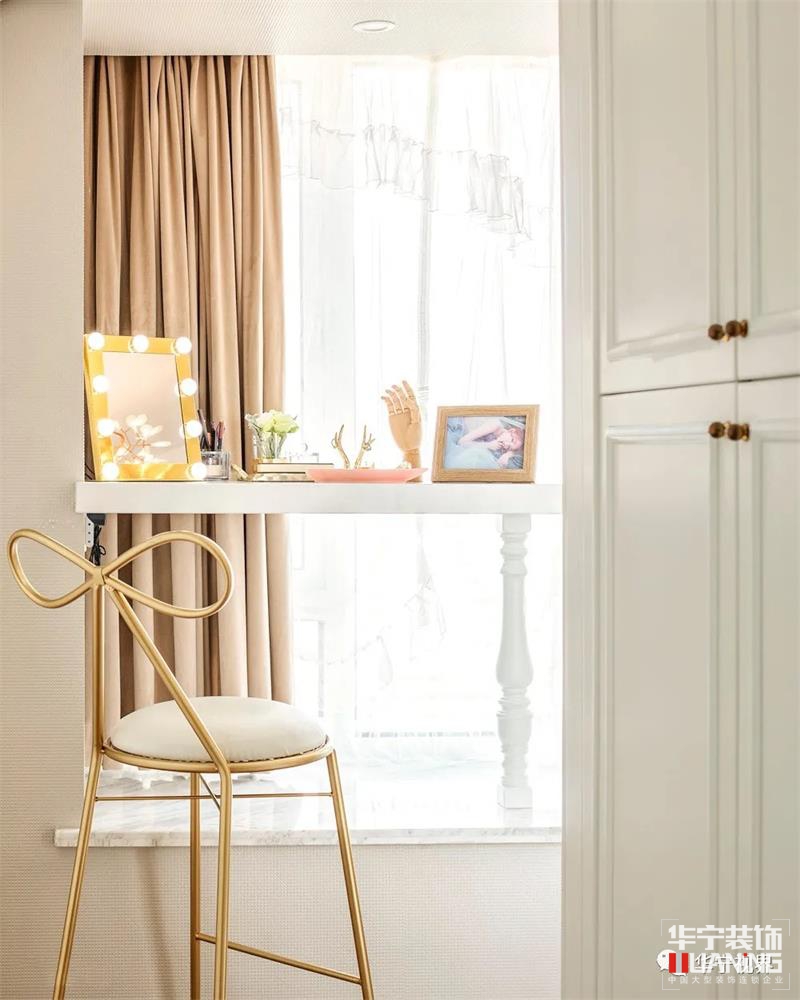 無論是蝴蝶結(jié)靠背座椅還是造型藝術(shù)化的擺件,衣帽間的一品一物都極盡精致之美。窗臺(tái)隔出一層平臺(tái)放置化妝鏡、香水等生活用品,趁著明亮的光線描摹美妝,這才是令所有女生心動(dòng)的小確幸。每一個(gè)小物件都是愛的印記,藏著故事,刻著時(shí)間。