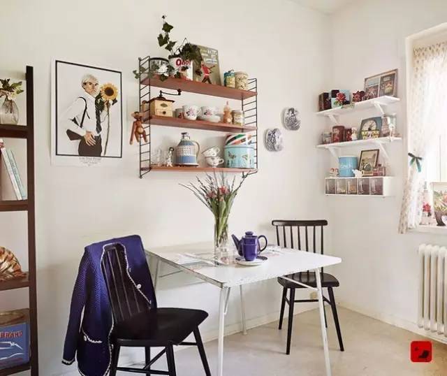 利用墻角的位置,安裝一個墻上置物架,暖暖的陽光灑下來,很溫馨哦,如果需要收納的東西很多,木板的夾層可以多一些。