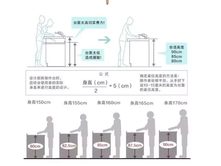 合理的動(dòng)線可以讓你少走路,合理的臺面則可以讓你操作更舒適。臺面高度并有一個(gè)固定值,通常還是根據(jù)家里做飯人的身高來制定,有人用這么一個(gè)公式: 臺面的高度=1|2身高+5cm;不夠直觀,直接看下圖↓