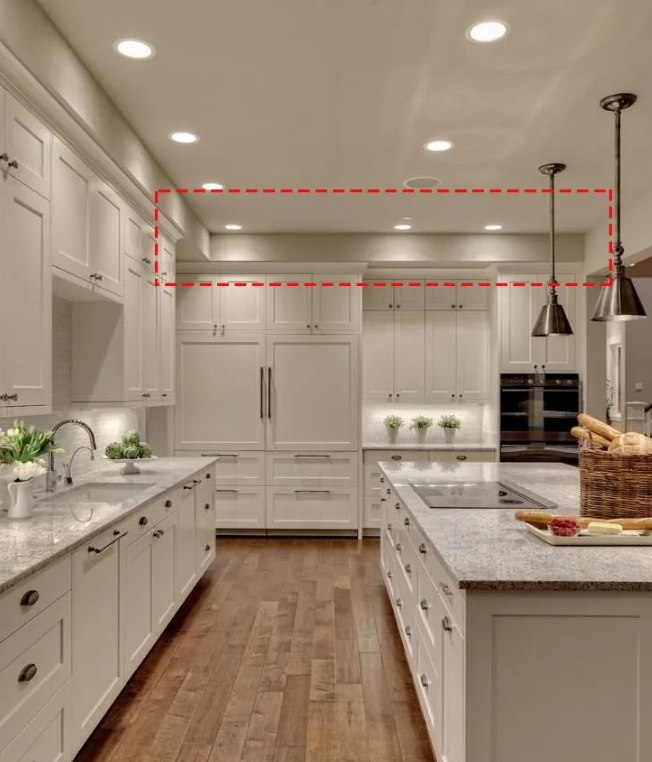 地柜+吊柜是廚房當(dāng)中主要收納空間,吊柜如果不做頂,浪費(fèi)收納空間不說,頂部還可能積攢灰塵或是油煙,清潔麻煩。