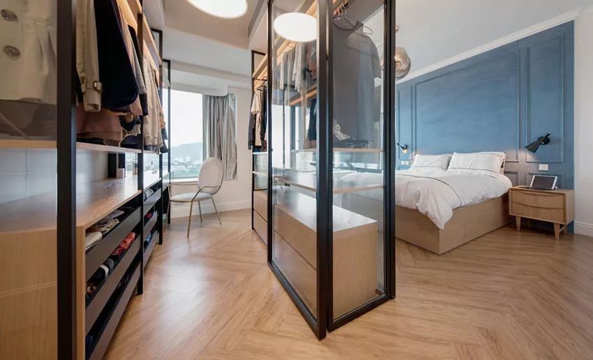 拉上簾子就能成為獨立區(qū)域。明亮的玻璃隔板,使視線不被隔斷,讓視覺有延展性,使空間看上去會顯得大些,采光也會好。