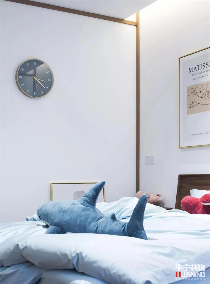 設(shè)計師不僅擅長空間結(jié)構(gòu)利用,同時也尊崇人使用的方便與私密性。二樓是兩個女兒的臥室,每個臥室都采用套房設(shè)計,包含獨立的衣帽間、衛(wèi)生間與茶水間,舒適而享受。大女兒臥室以丹青色為主色調(diào),純白為底色,木質(zhì)線條勾勒線條輪廓,整體簡約清爽,裝飾畫、小擺件等精致的軟裝搭配突出空間的文藝氣息。
