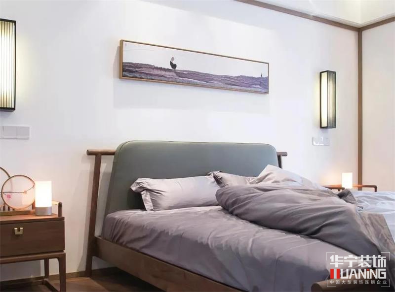 三樓是主人臥室,一切陳設(shè)落得簡凝妥當。整體素雅色調(diào),充分尊重空間的排列,突出功能價值。中式對稱式設(shè)計,山水畫、壁燈、擺件意蘊深遠,以含蓄的現(xiàn)代方式詮釋東方意境,展現(xiàn)出主人高遠深邃的精神世界。