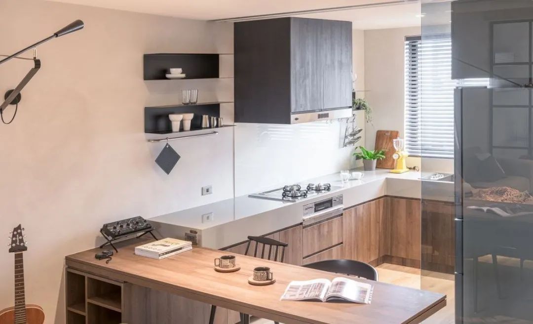 像是一字型廚房就很適合小宅設計,或是加一個中島吧臺、延伸出餐桌,都能夠讓不到60平米的室內空間,擁有通透明亮的居家氛圍。