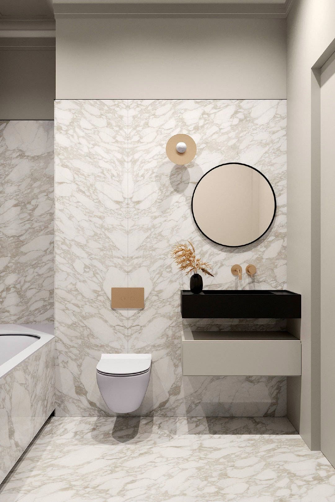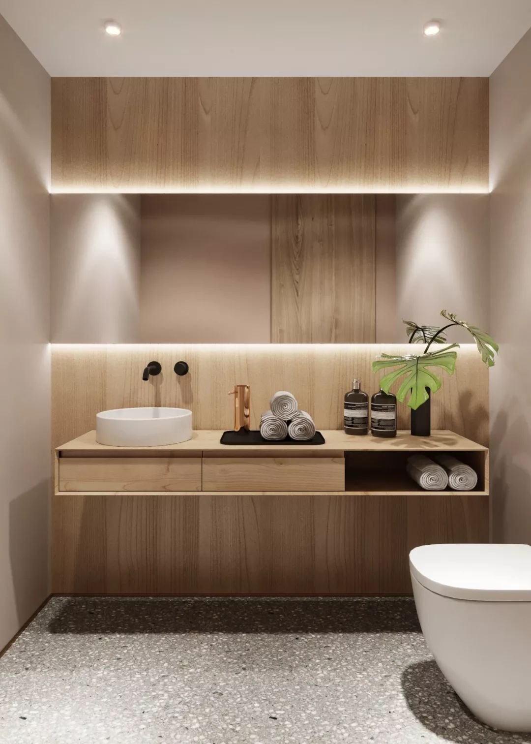浴室鏡子的正面和頂部、馬桶背景墻、角落區(qū)域等都可嵌入燈帶。光源分布均勻,可以襯托溫暖的氛圍,增強(qiáng)空間層次感。