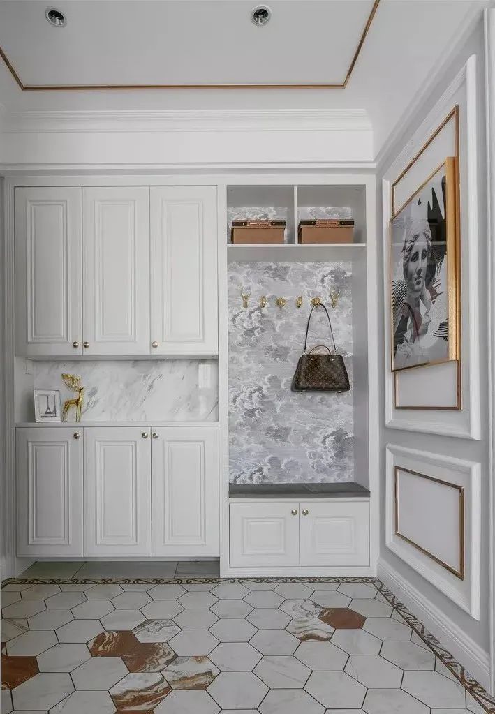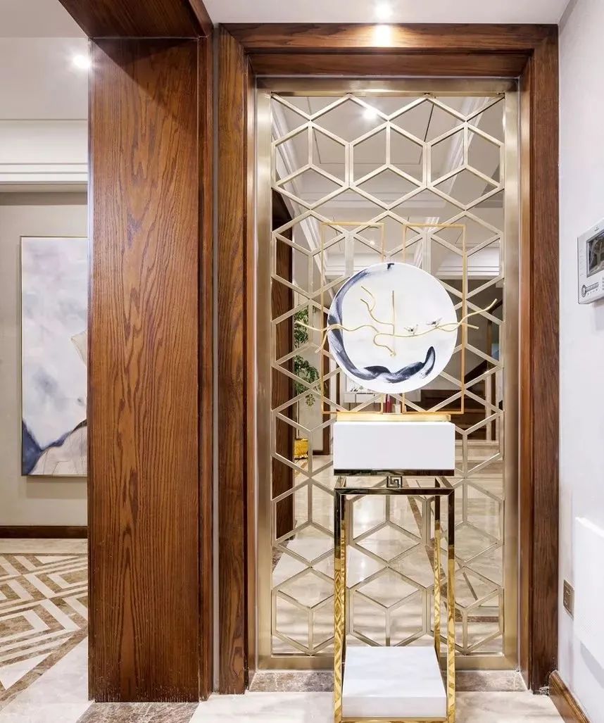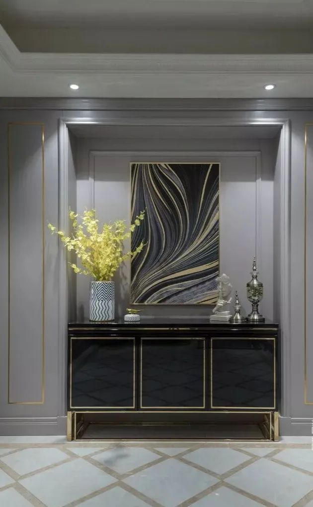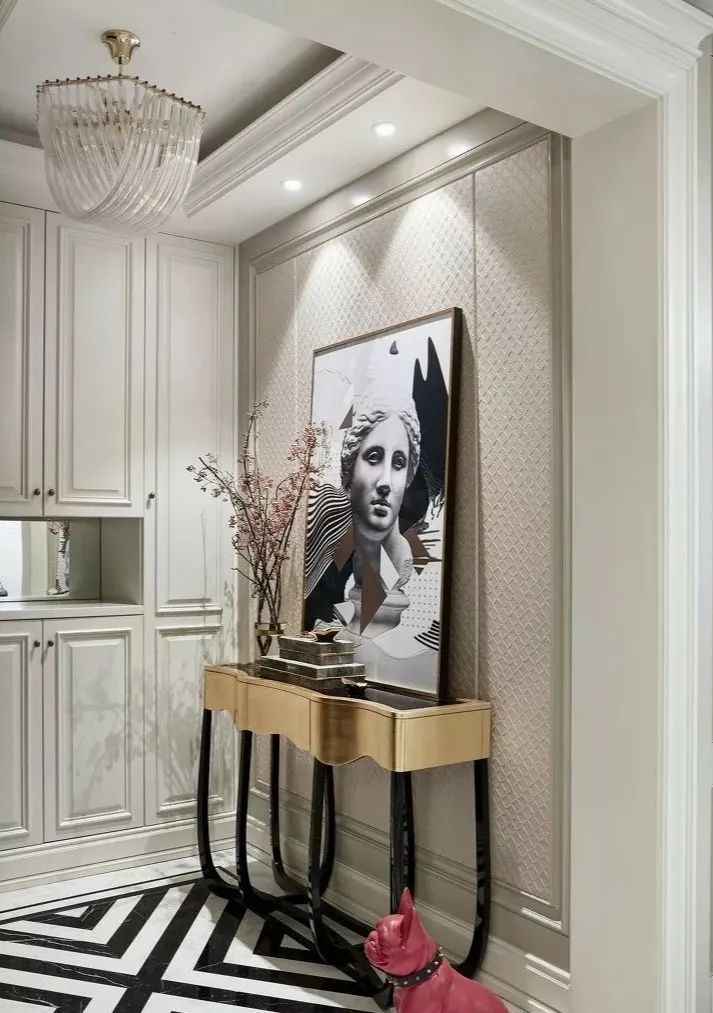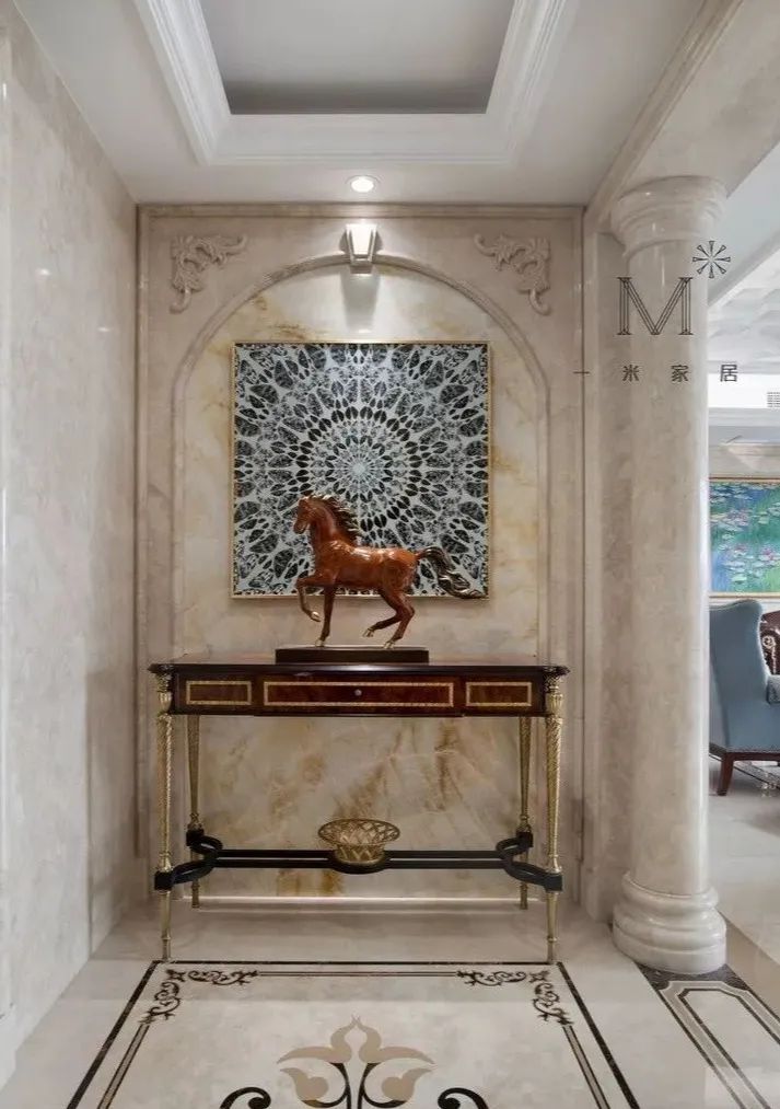拼花和微晶石,絕對(duì)是豪宅必備。繁復(fù)貴氣的拼花,搭配光彩亮麗的燈飾、富有藝術(shù)氣息的軟裝,讓玄關(guān)富麗堂皇。
