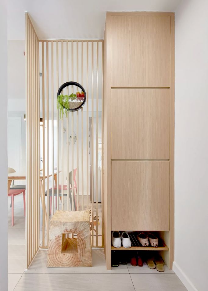 上半部分采用鏤空隔斷,最大化地保證空氣流通;下半部分則利用收納型柜體加以組合,既可起到基本的遮掩作用,又發(fā)揮了一定的收納功能,讓人一進(jìn)門就體味到家的溫馨。