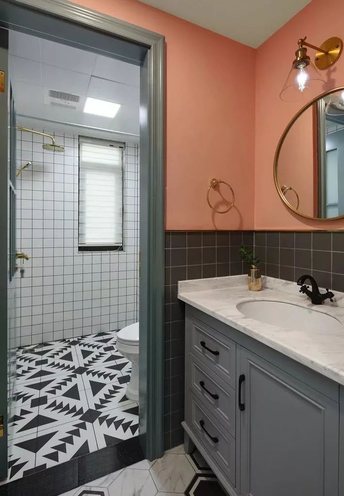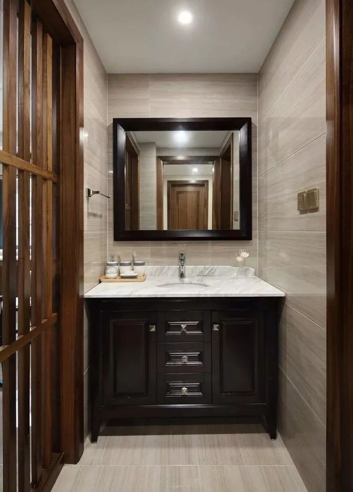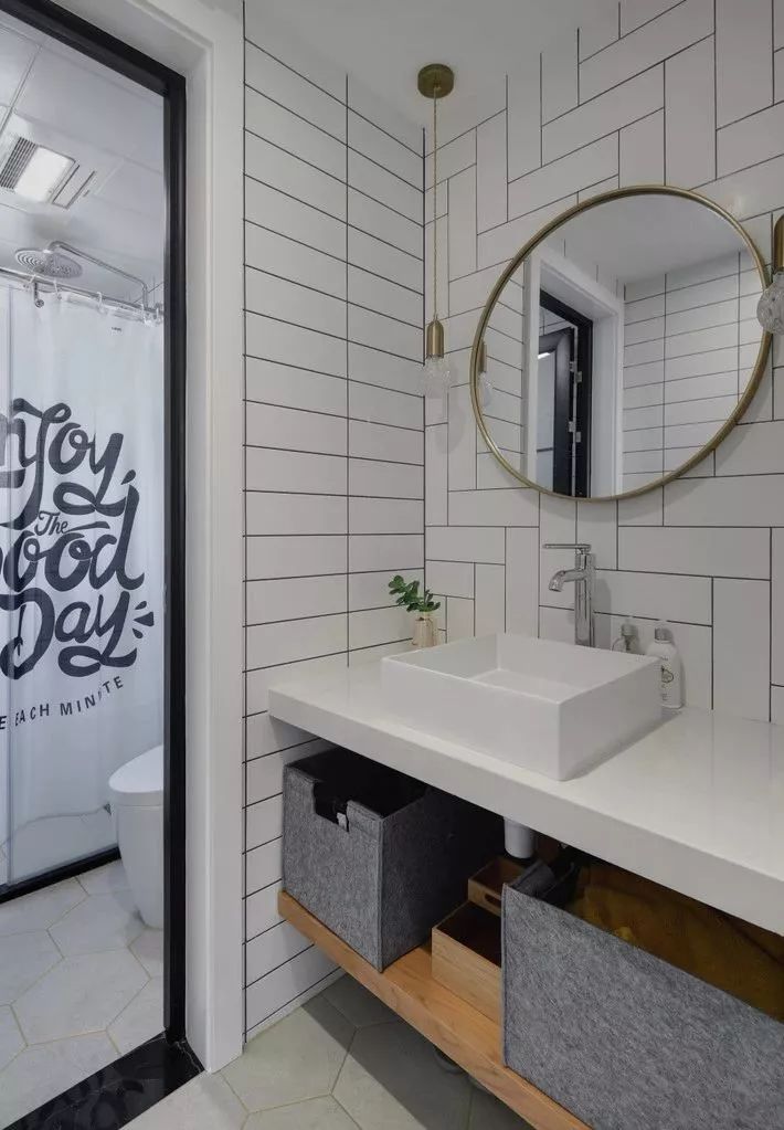 利用干濕分離的形式來(lái)解決也可以哦,將洗漱臺(tái)外移,把如廁區(qū)和淋浴區(qū)都放在里面,這樣隔離出來(lái)的洗漱區(qū)就可以阻隔外來(lái)的視線。