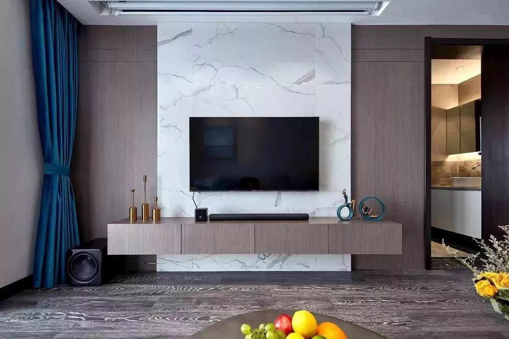 電視背景墻是客廳非常重要的一部分,常規(guī)的設(shè)計(jì)就是:選擇一種材質(zhì)做電視墻,再擺上一個電視柜、放一臺電視。