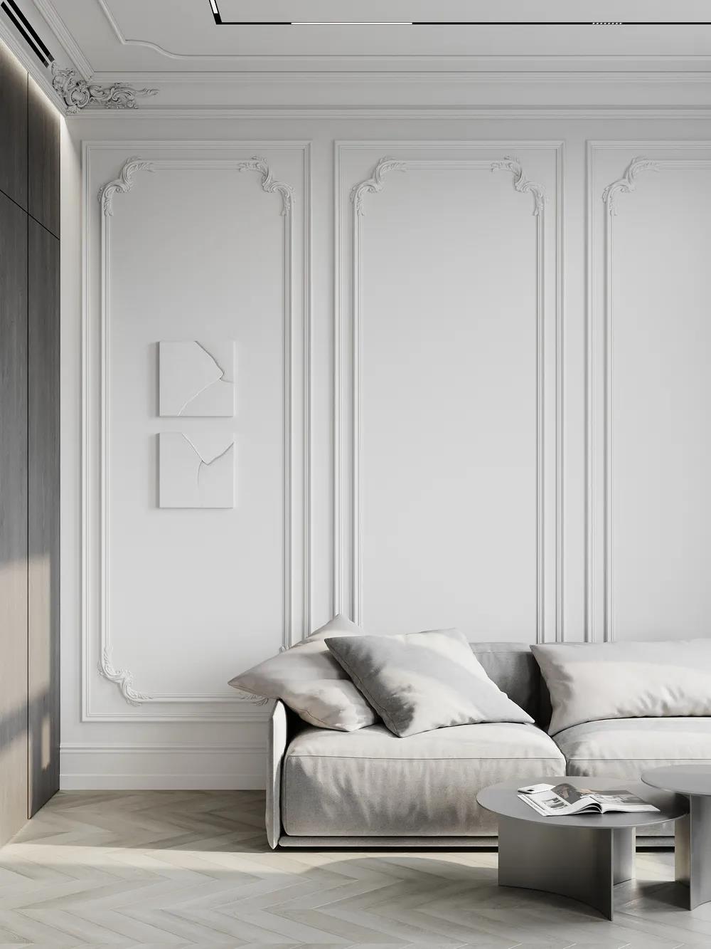 而用護墻板、石膏線或者壁紙、隔音棉等等作為下半部分,往往帶有精致的線條或柔軟的紋理觸感,為空間增添復(fù)古情愫。