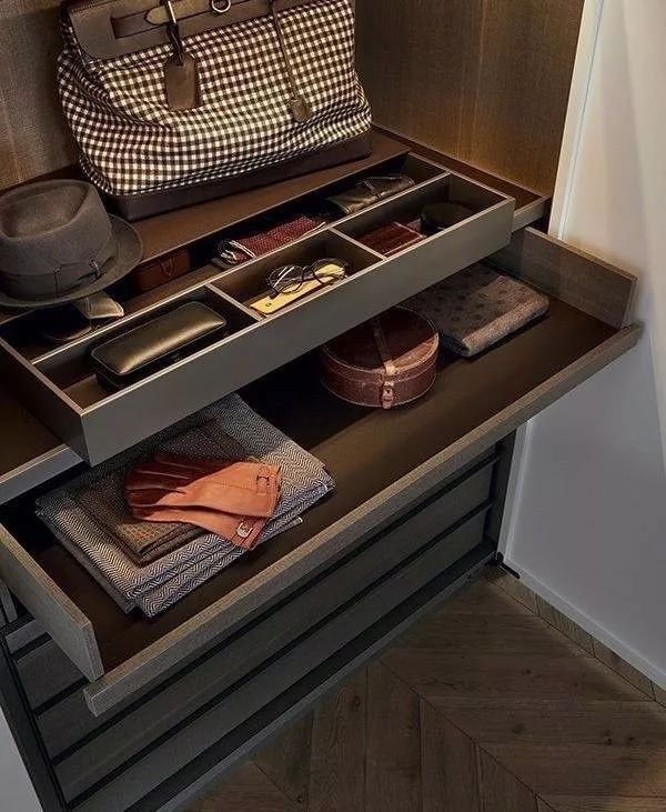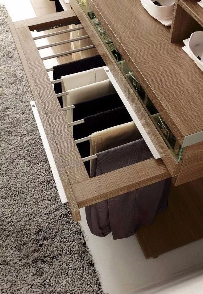 掛桿:帶滑軌的金屬掛桿是衣帽間的一大特色,阻尼靜音設計的滑軌,抽拉更加順滑,還不會劃傷衣物,很適合掛放高級絲巾、領帶、圍巾、披肩等配飾。