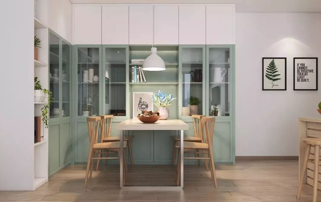 餐廳餐桌區(qū)域,在餐桌正上方可采用一個(gè)小吊燈的設(shè)計(jì),做好重點(diǎn)照明工作,注意吊燈款式的選擇。