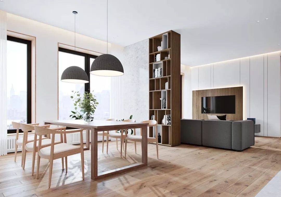 客餐廳一體設(shè)計(jì),讓空氣更為流通,同時(shí)也節(jié)省了空間,那么如何處理好這個(gè)大開(kāi)間,讓功能區(qū)很好的區(qū)分,既實(shí)現(xiàn)兩空間的職能,又能讓活動(dòng)空間更充足,通透寬敞。