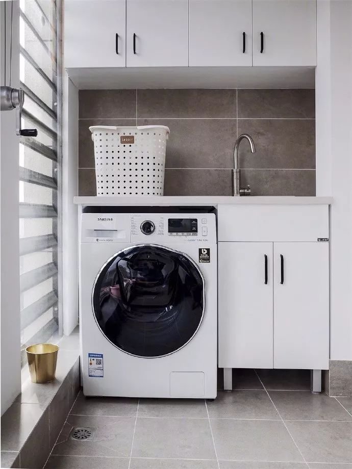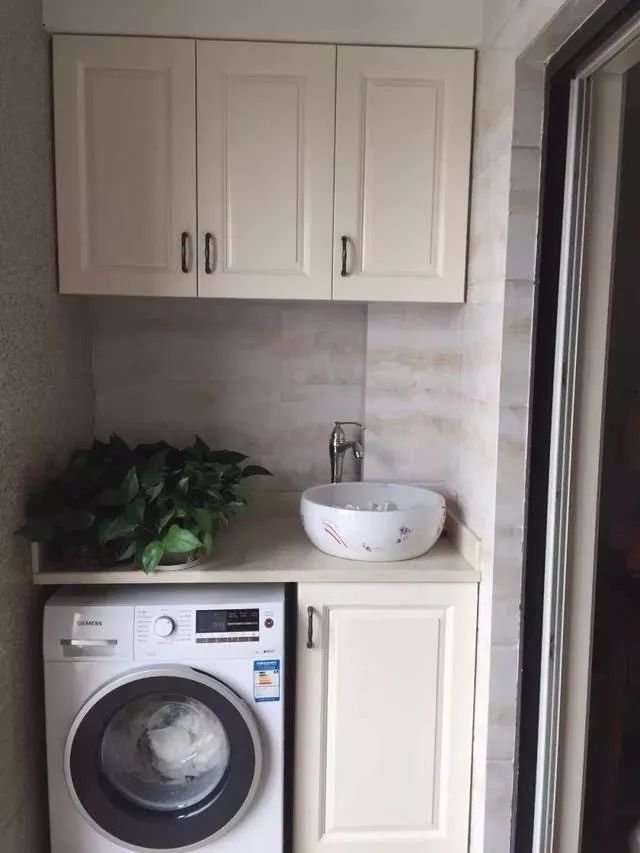 在小戶型陽臺的一側(cè)做上洗衣機、洗手臺和吊柜的組合式設(shè)計,選擇滾筒洗衣機,這樣上方的臺面空間也能用起來,非常實用。