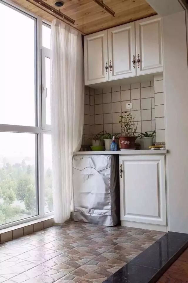洗衣機上方是玻璃的,那么就減少一部分的收納空間,加上更為有格調(diào)的燈具作為裝飾,搭配這種彩色的仿古磚,讓陽臺多出一些復(fù)古感。