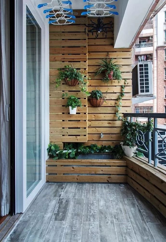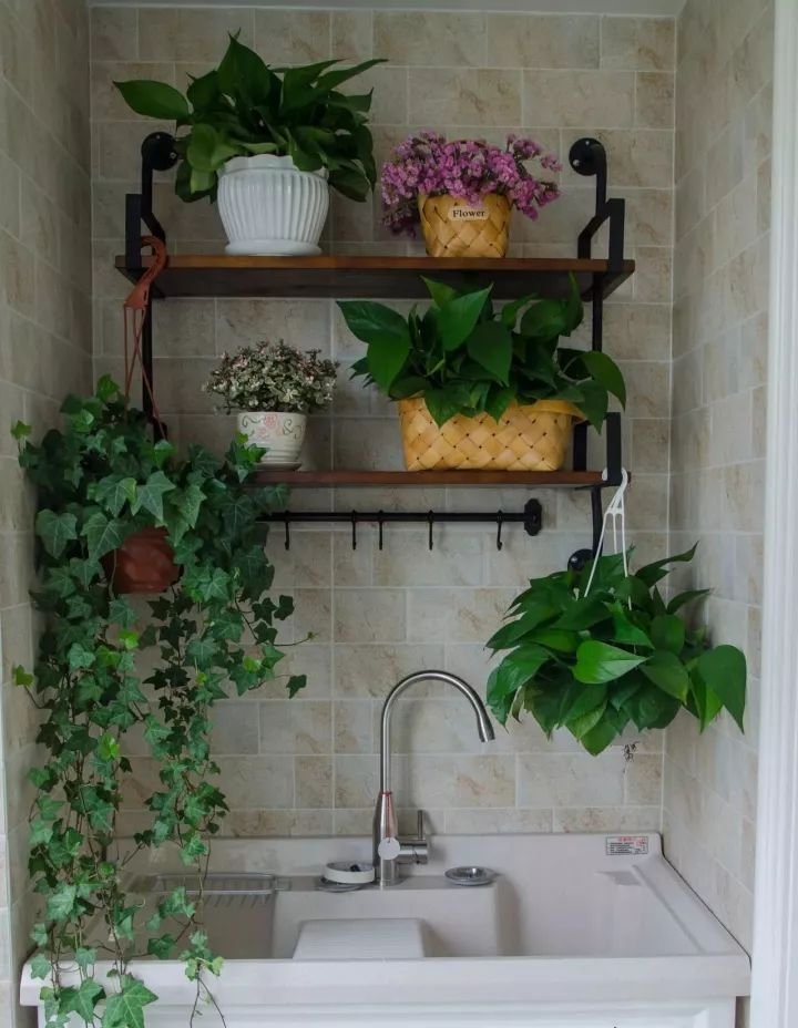 陽臺的洗手臺上方空間可以考慮做置物架來放點綠植,或者直接掛墻上,這樣不會占用多少的空間,又能讓你家多出一些自然感。