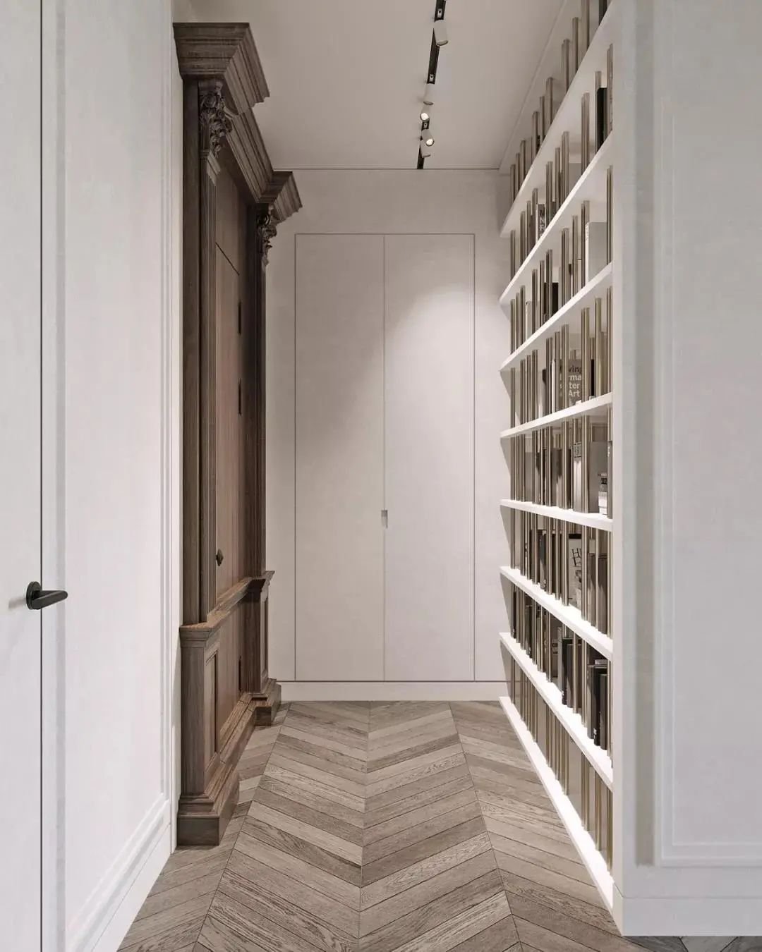 走廊中嵌入書柜、書架等,放上滿滿的圖書,打造成家里的閱讀區(qū)。當然,同步潮玩展區(qū),一樣行得通。(注意做好防潮)