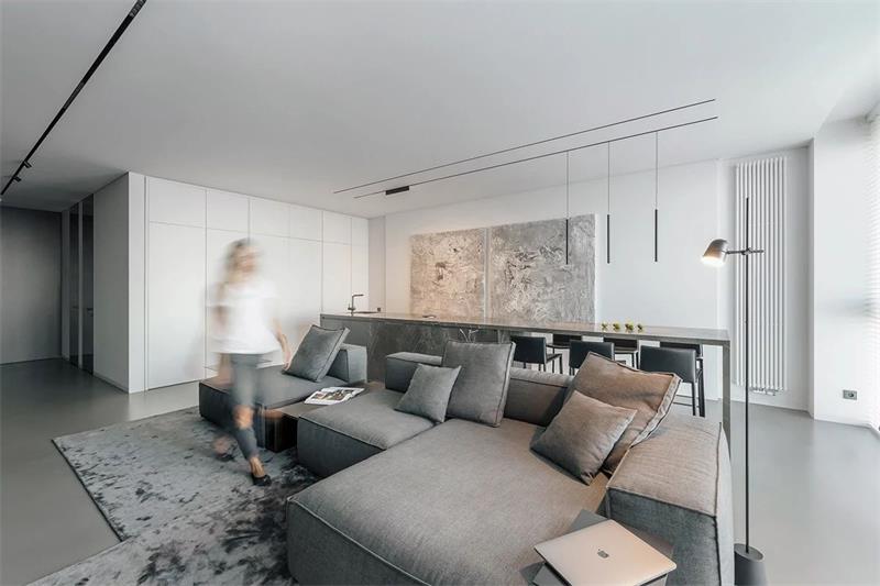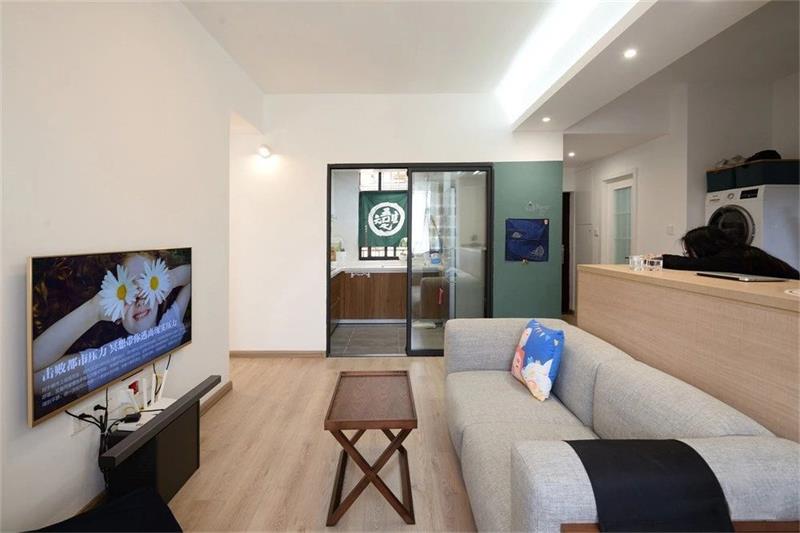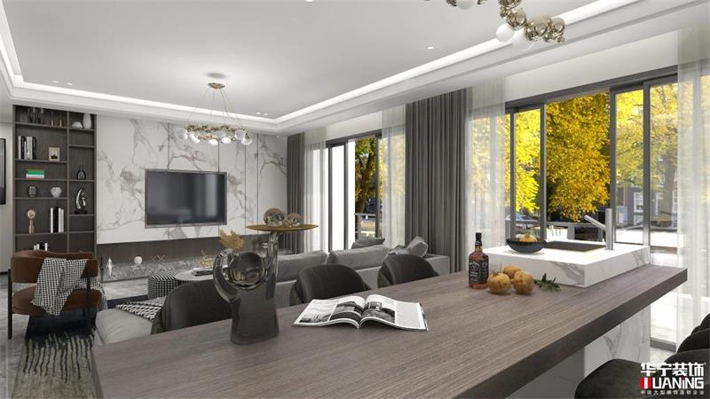 如果客廳的空間足夠大,可以選擇將吧臺設(shè)計(jì)在沙發(fā)背面,不過要注意沙發(fā)與電視的距離,開間過短的客廳不建議這樣設(shè)計(jì)。