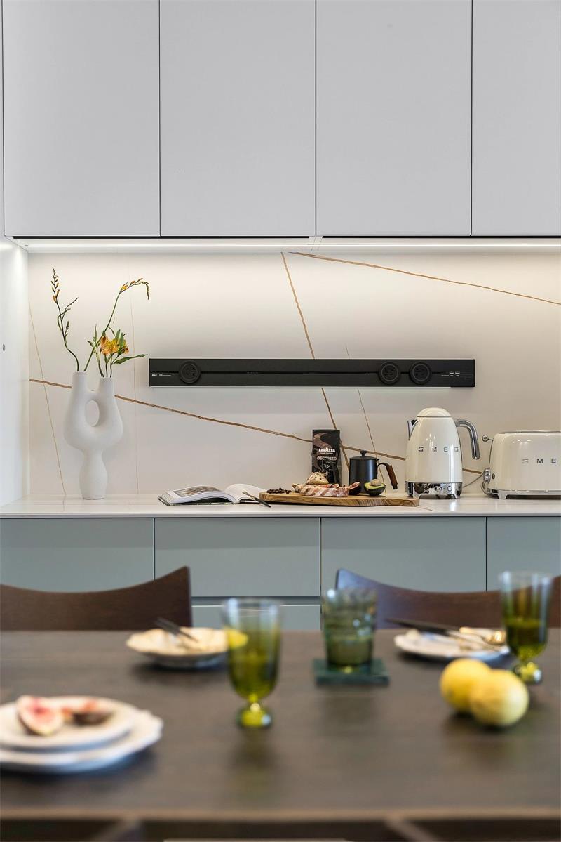由于身體和吊柜的遮擋,廚房頂燈的光線會有大面積的死角,非常影響洗菜備菜的體驗,在吊柜下方加裝感應燈帶可以完美解決問題。