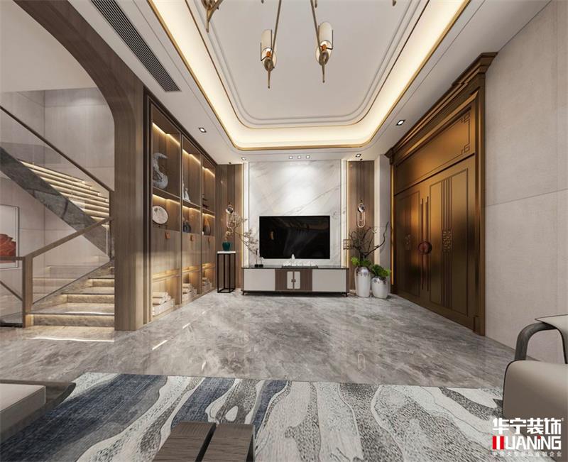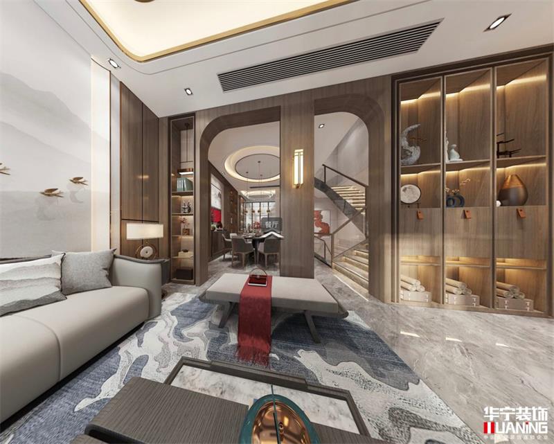 客廳延續(xù)了傳統(tǒng)圍合式的方式進行.布局中正、大氣、開敞,家具在空間中的放置分合有致,既可眾客以聚,亦可圍合小敘,椅踏端莊、案幾有序、器物風雅,極具大宅之氣。
