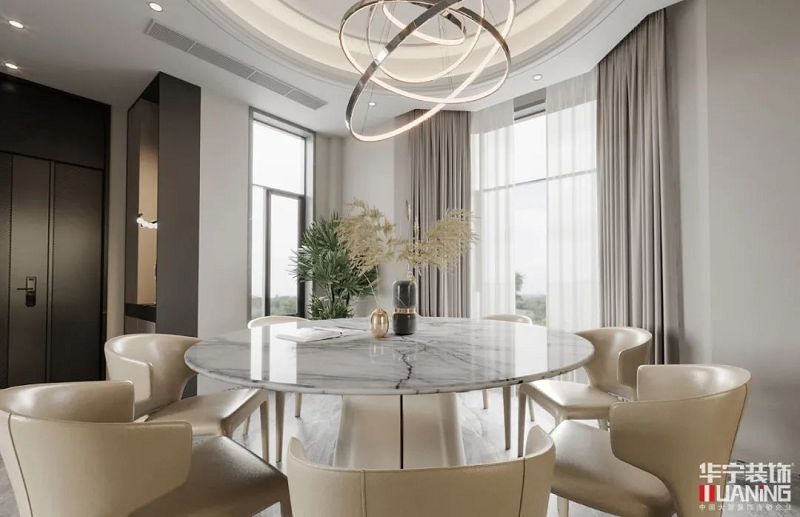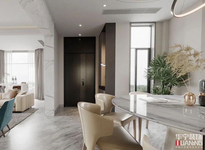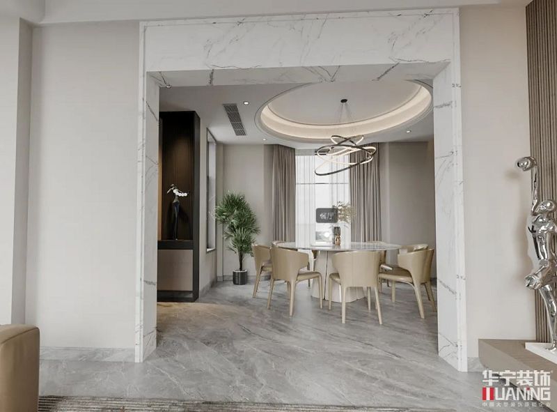 餐廳所處的位置,于某種意義而言也是樞紐中心。除去要規(guī)劃好它與各功能分區(qū)的動線關(guān)系之外,對其在入口處或是客廳等各個視角的呈現(xiàn)也需要慎重考量。