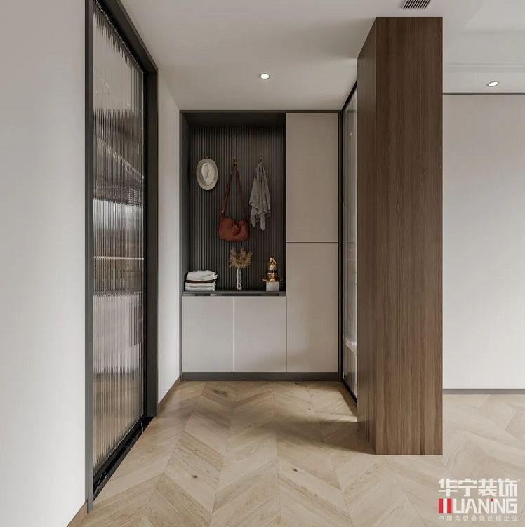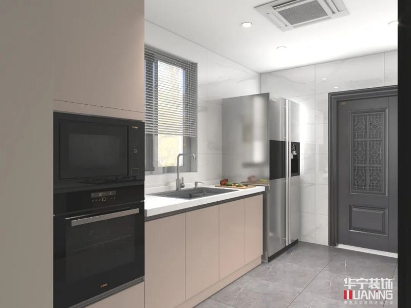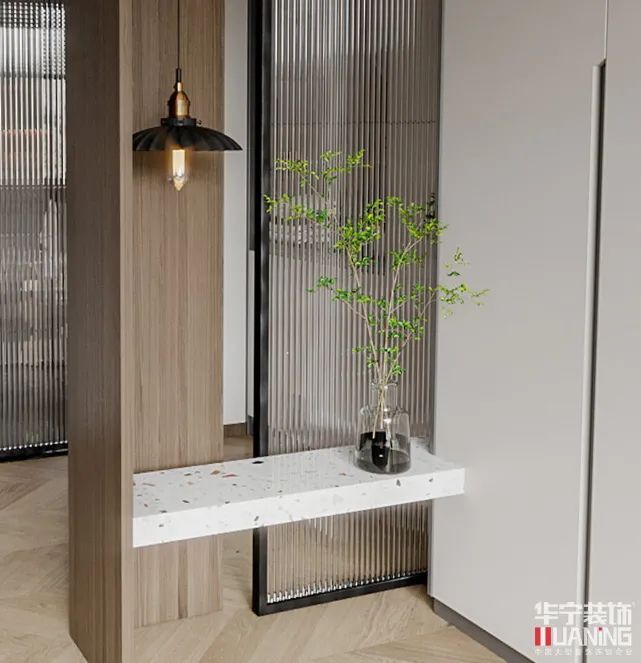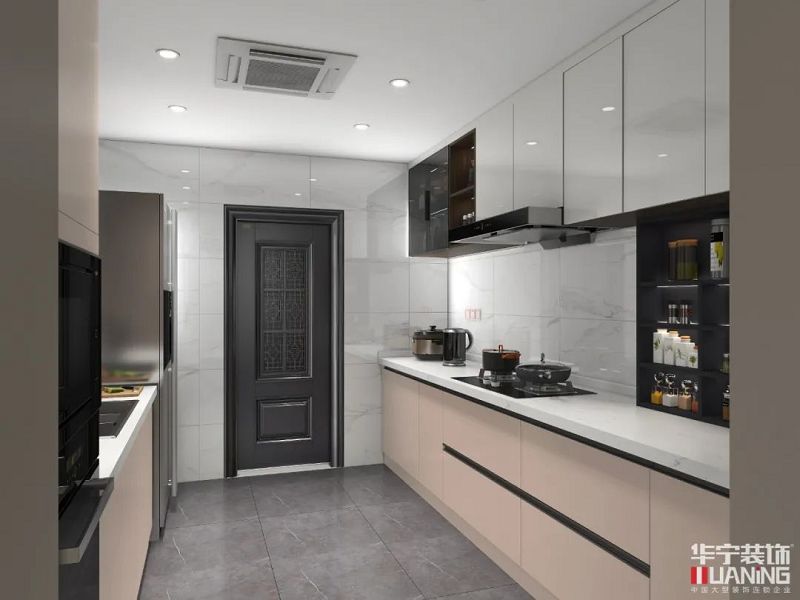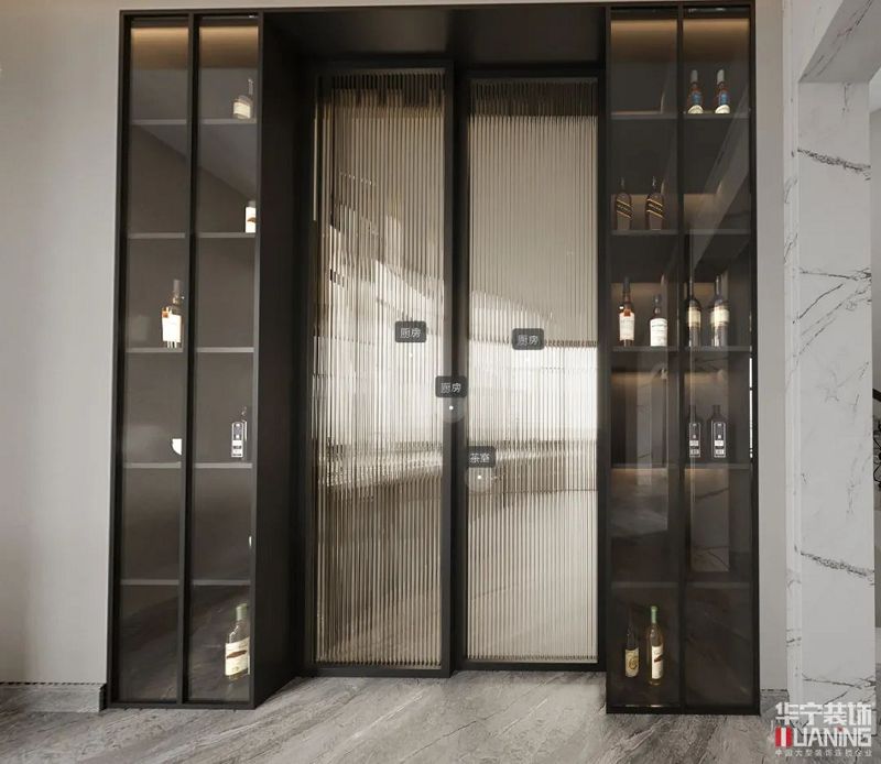 廚房兩側(cè)是對儲物空間的補充,考慮到日常做飯頻率高而導(dǎo)致的油煙問題,業(yè)主舍棄了純開放式廚房,以條紋玻璃隔斷達到視覺上的通透效果。