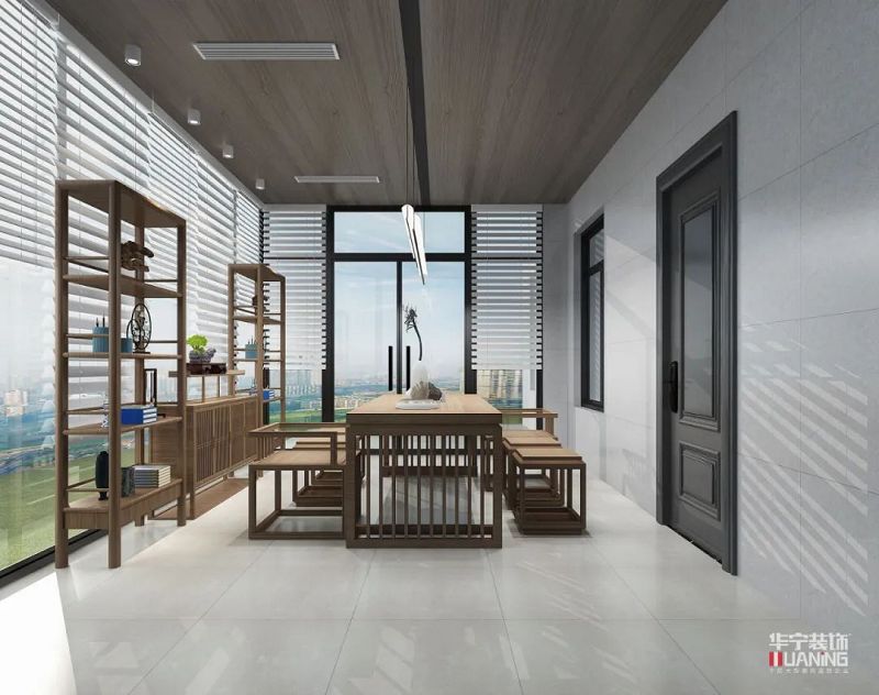 開敞的茶室將窗外美景盡收眼底,室內(nèi)與室外自然融合 ,原木色的茶桌襯托著器皿的精致,營造閑逸而舒適的空間氛圍。