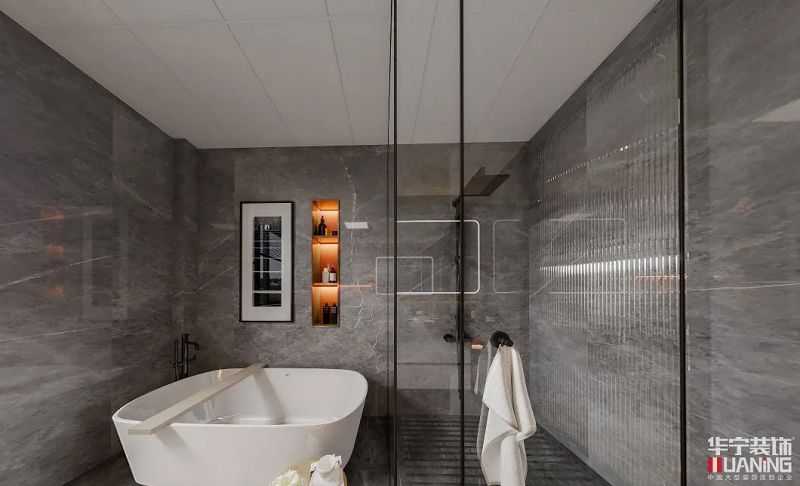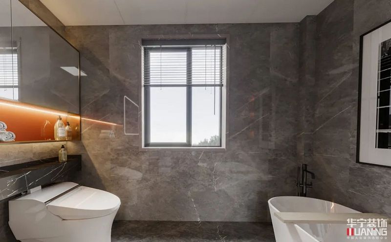 衛(wèi)生間功能完備。大理石的奢華中保持素雅的整體風(fēng)格,雙洗手臺上智能鏡柜,雙臺盆及落地獨立浴缸設(shè)計讓主人不受拘束,恣意發(fā)揮。光透過百葉簾,為空間帶來自然的流動。