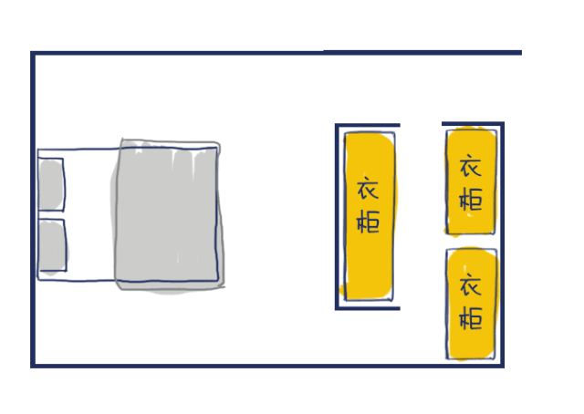 如果臥室不大,我們找到房間一角,利用“L形”布局和床頭,拼出一個三角區(qū)域,臥室衣帽間就誕生了。