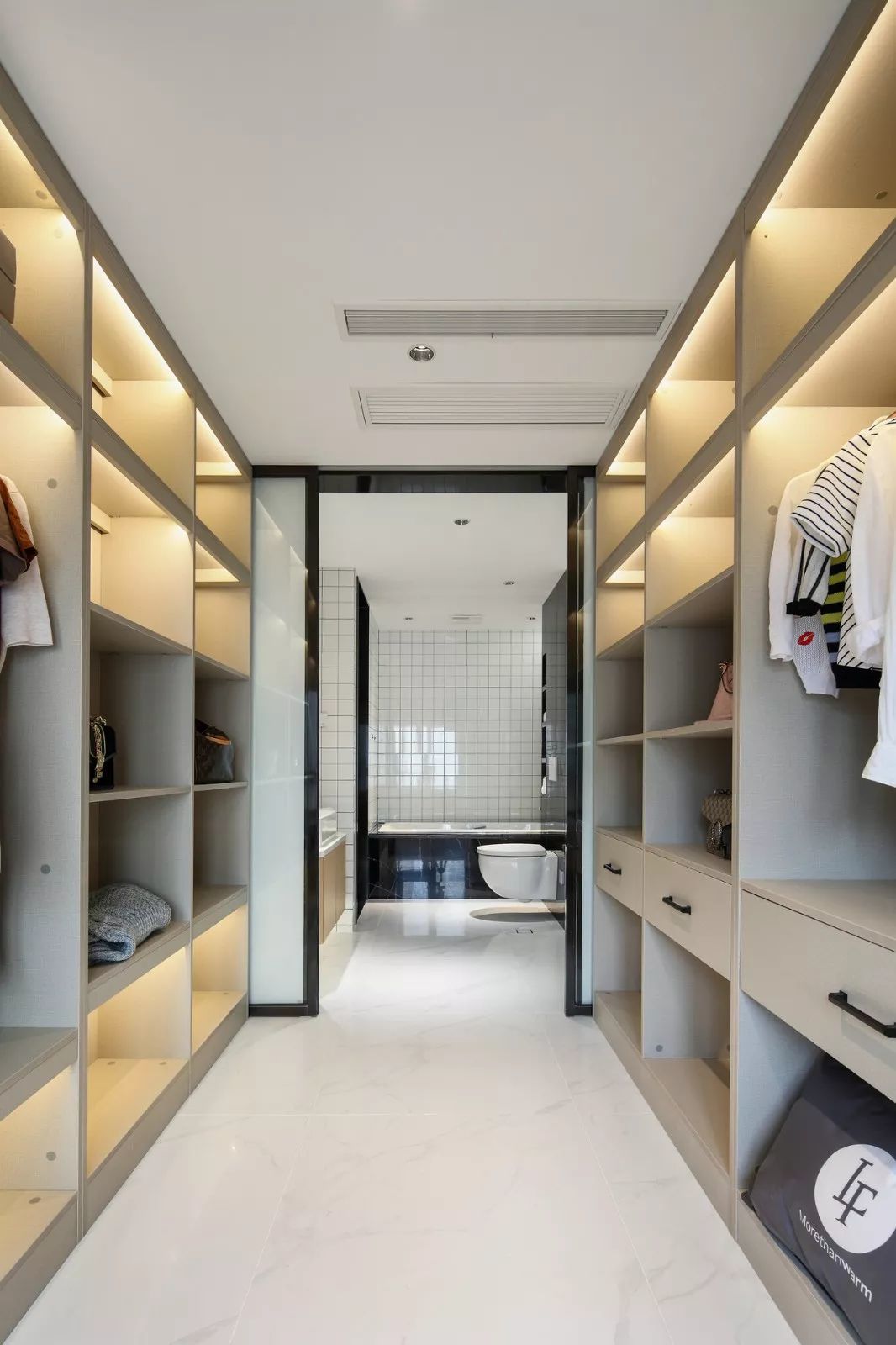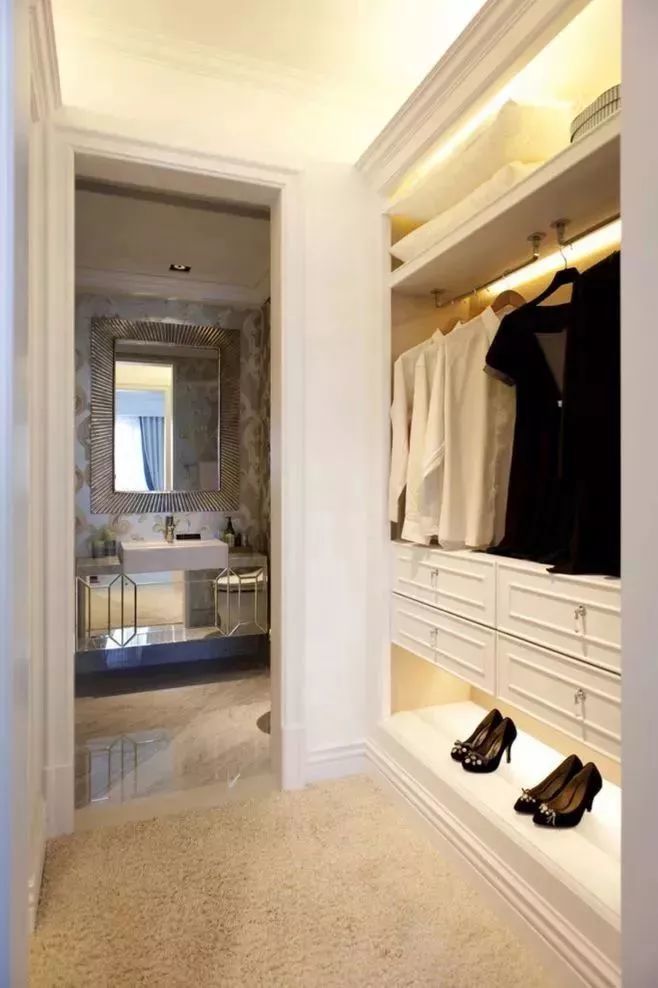 如果是帶衛(wèi)生間的臥室,還可以把衣帽間設置在臥室通往衛(wèi)生間的過道上。除了布局可以采用“I形”,如果過道夠寬,也可以設計成“II形”衣帽間。