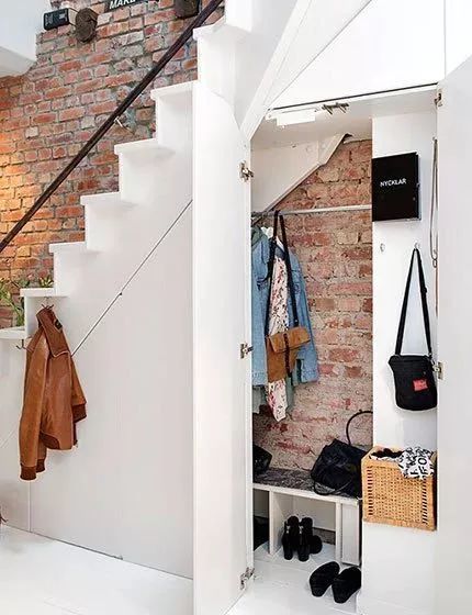 對于小LOFT來說,樓梯下斜斜的空間一般用作儲藏室太過可惜,它可是絕佳的改造位置。稍微用點小心思,就能擁有一個別有洞天的衣帽間哦!
