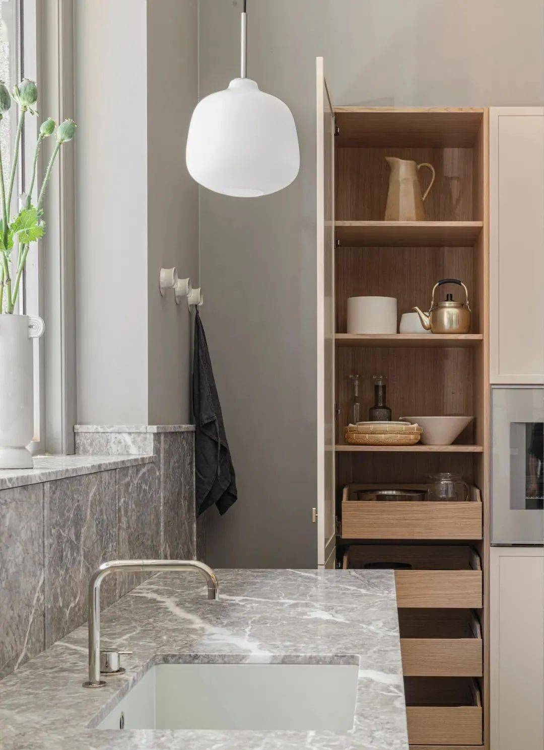 廚房絕不該只是一個做飯、勞動的空間,喝咖啡、品酒、玩烘焙等各種興趣愛好,都可以安置在這個位置,給自己一個治愈的居心地。