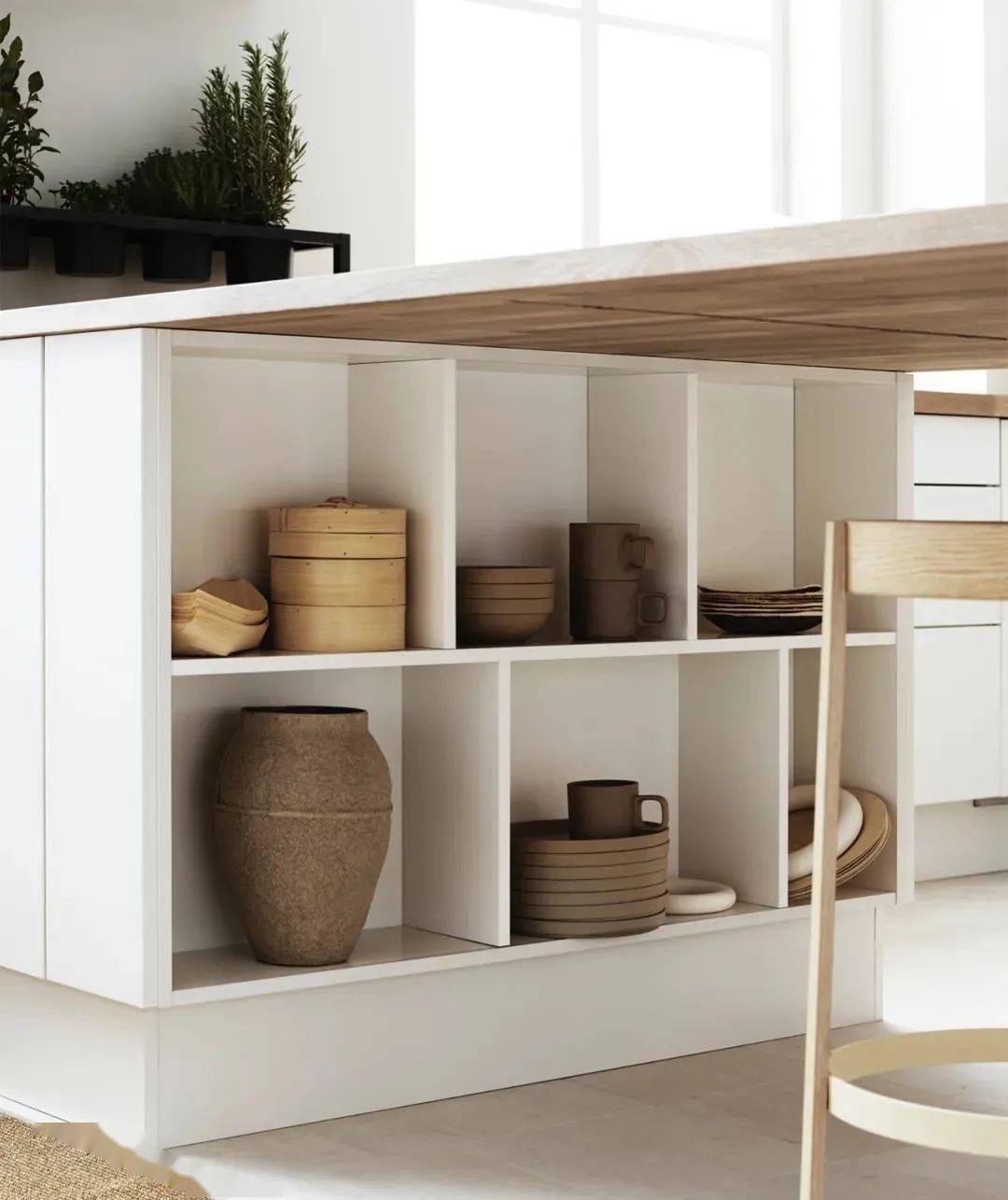 無論是餐廚過度空間的島臺,還是挪至窗前、餐廳的吧臺,盡量把下面空間做儲物利用起來。比如嵌入電器、存放米面糧食、放備用餐具等。