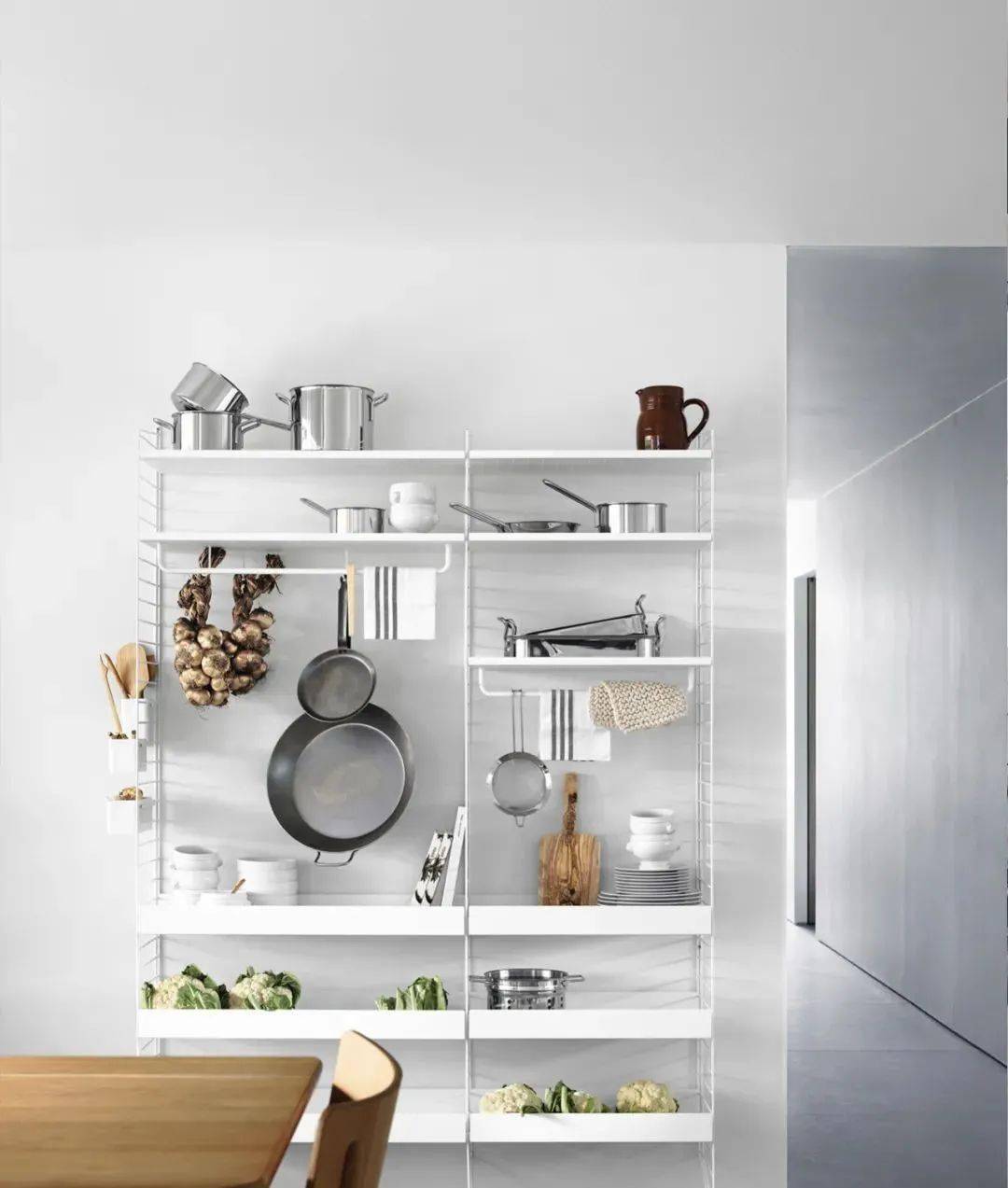 如果廚房面積偏小或空間有限的話,不妨擴展一下周邊空間利用率,比如用餐廚過渡區(qū)取代餐邊柜,利用餐廳區(qū)域打造第二收納空間,一些好看的鍋具、用具放在這兒,除了收納還能做展示用,一舉多得。