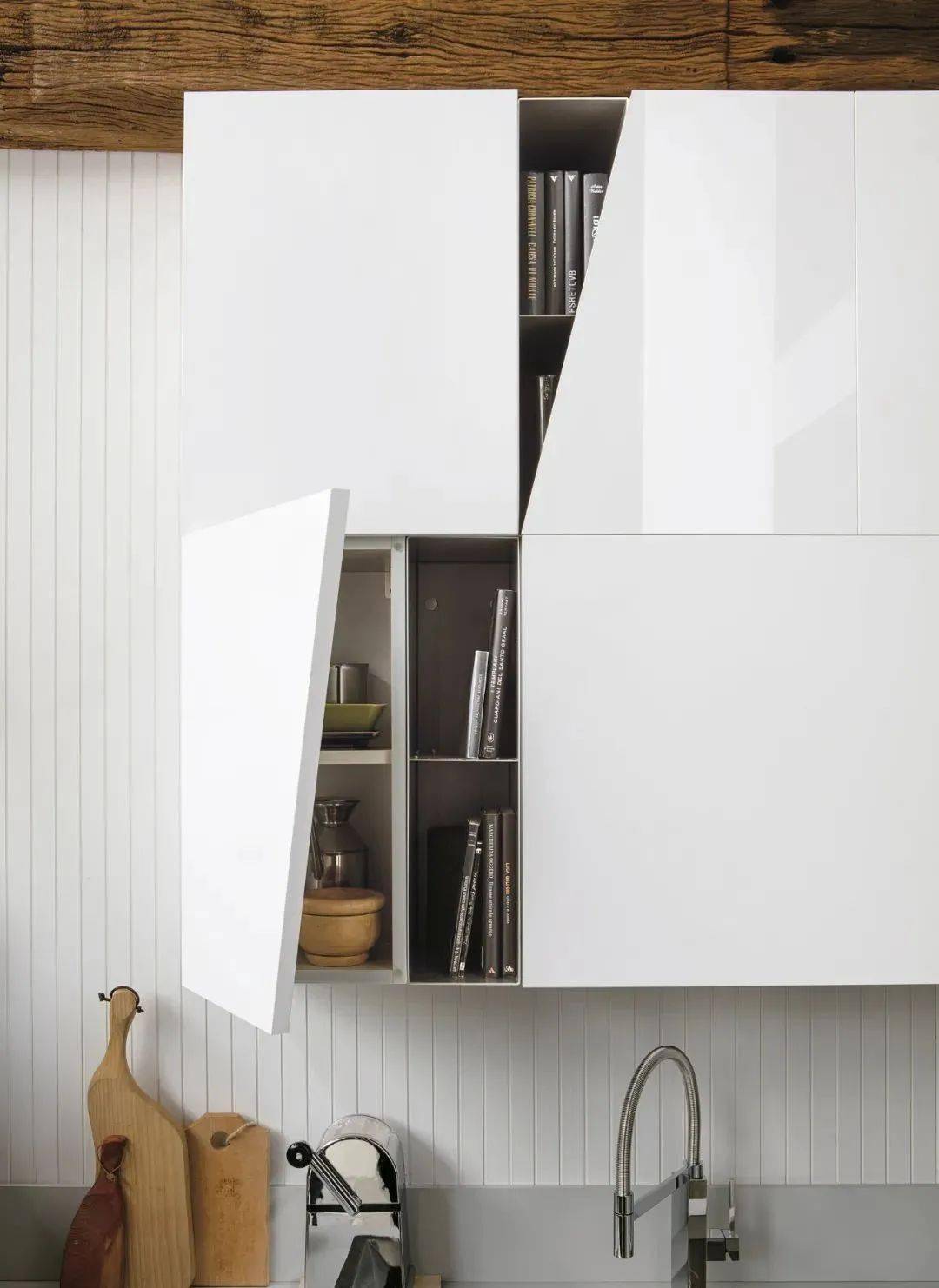 吊柜可以說是廚房的巨無霸收納,和地柜上下組合,基本就能搞定廚房所有物品,電器、食物、廚具等,通通都可以裝進去,關(guān)上門干凈利落。