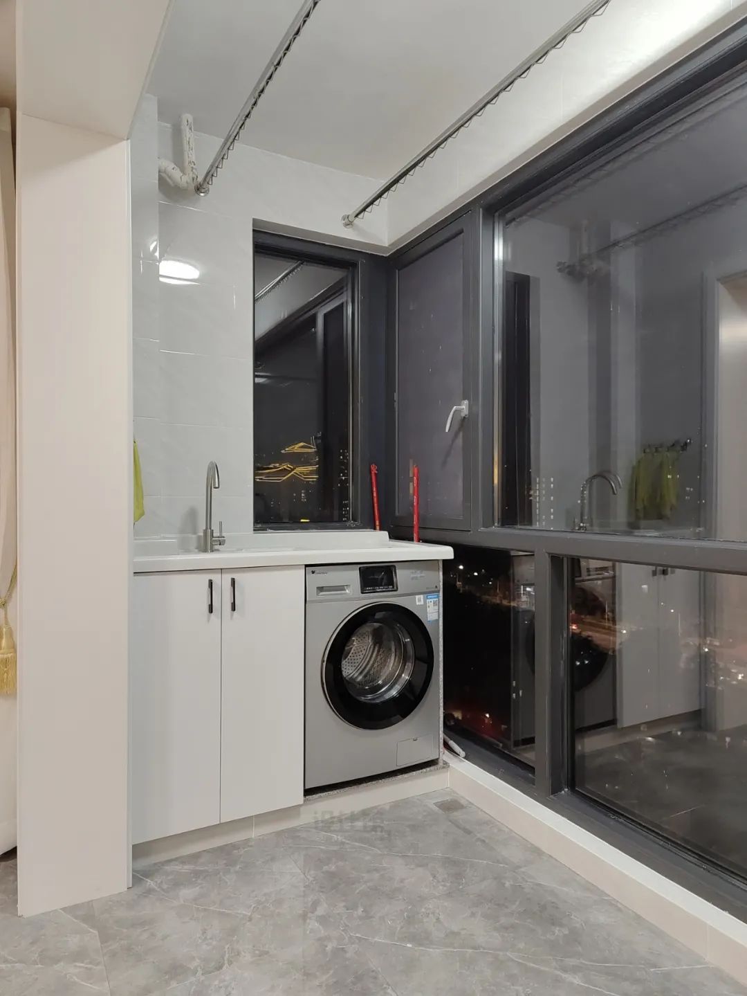陽(yáng)臺(tái)做成開放式,那么曬衣物的問(wèn)題也來(lái)了,對(duì)于家里不常來(lái)客人的話,那么陽(yáng)臺(tái)納入客廳,直接曬衣物也是沒(méi)關(guān)系的;如果追求美觀的空間,不想在客廳看到晾曬的衣物,也可以采取洗衣機(jī)+烘干機(jī)的組合,就我接觸的很多年輕客戶中,也是有不少人是習(xí)慣用烘干機(jī)烘衣物的。