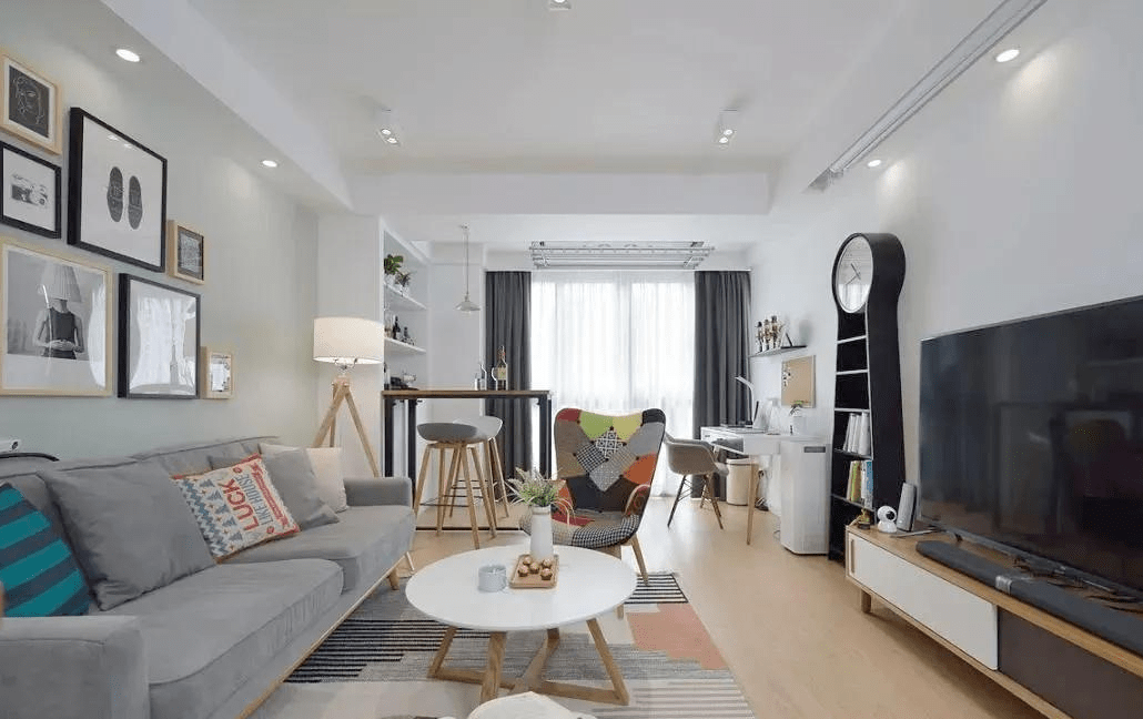 另外,在裝修前期規(guī)劃中,也可以通過窗簾遮擋住晾曬衣服的這部分小空間,這樣整體客廳看起來美觀又實(shí)用。
