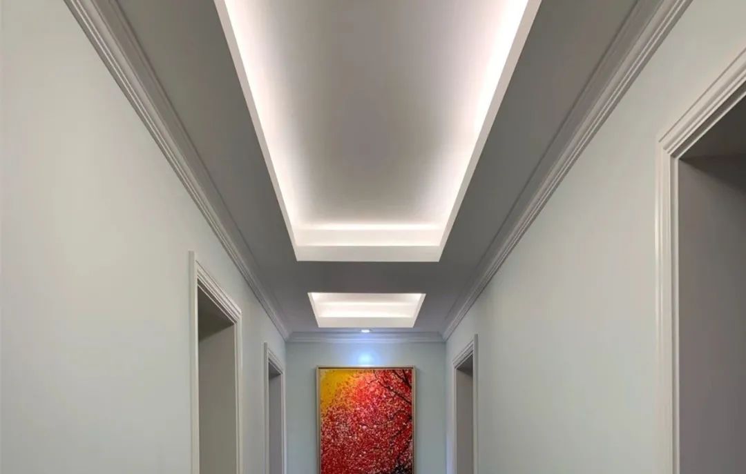 如果走廊的天花沒有橫梁,也可以采取四周吊頂+燈帶的設計,這樣可以使得空間更加有層次設計感;并且通過見光不見燈的設計,也能讓走廊空間顯得更加溫馨舒適。
