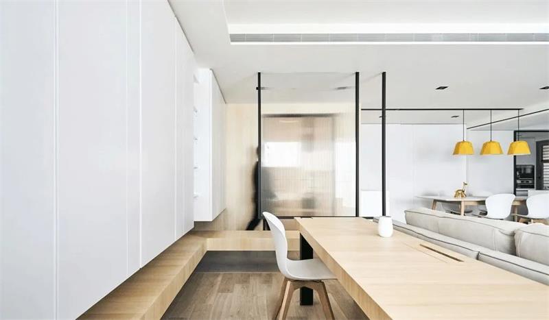 客廳作為會(huì)客很少占地很大的區(qū)域,增添書房功能再合適不過了。