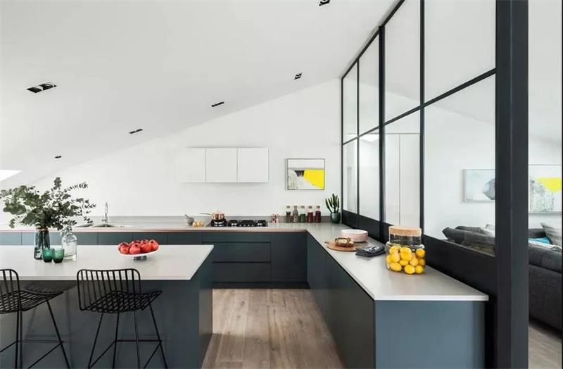 其設(shè)計原理等同于封閉式空間,區(qū)別在于將原有的非承重墻面替換成可推拉/折疊的玻璃門,形成一種半透明狀的烹飪空間。