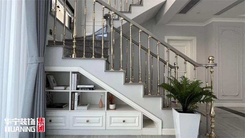 樓梯摒棄原始相對(duì)封閉的形式,變成了極具安全性和美觀度的空間裝置。踏步寬度、踏步高度、傾斜角度、欄桿間距等都符合人體力學(xué)。適度的樓梯高度,方便孩子上下通行。樓梯下的儲(chǔ)物柜大大增加了收納功能。
