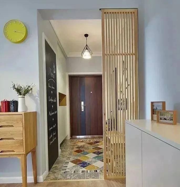 在沒有玄關(guān)的情況,利用增加隔斷墻、鞋柜等設(shè)計(jì),創(chuàng)造出一個(gè)假的玄關(guān)。一方面可以化解進(jìn)門見廳的尷尬,另一方面也解決了鞋柜擺放的問題。