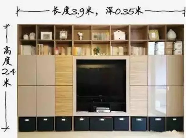 下面讓我們計算一下,電視柜的容量:3.9*2.4*0.35=3.3立方米。沒有直觀概念?20寸的登機箱是0.5*0.34*0.19=0.03立方米,算下來,這面電視柜可以收納100個20寸的登機箱能裝的東西!