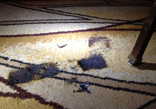 如果不慎將地毯燒焦,可用修補法先將燒焦處盡量用硬毛刷刷掉,然后可將地毯其他地方的絨毛用剪刀剪下,再用粘劑把它粘在燒焦處,用相當于書本輕重帶平面的東西壓在上面,待粘合劑干燥后,粘上的毛牢固了,最后用毛刷輕輕梳理一下便可。