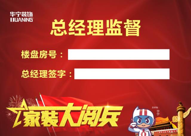 華寧裝飾集團(tuán)設(shè)有客戶關(guān)系管理中心和質(zhì)量控制中心,為全國(guó)裝修客戶保駕護(hù)航。此次活動(dòng)期間,簽單交訂的客戶可獲得由質(zhì)量控制中心授權(quán)分公司頒發(fā)的總經(jīng)理監(jiān)督牌一塊,由質(zhì)量控制中心及分公司總經(jīng)理共同監(jiān)督工地施工質(zhì)量,讓每位消費(fèi)者在裝修過(guò)程中放心、省心。