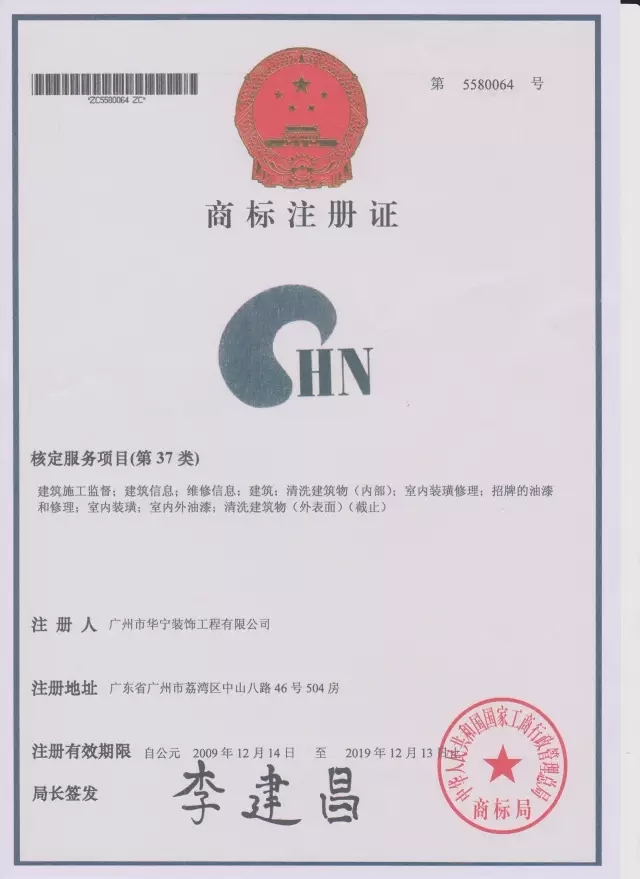 廣州市華寧裝飾工程有限公司持有的商標(biāo)注冊(cè)證▲