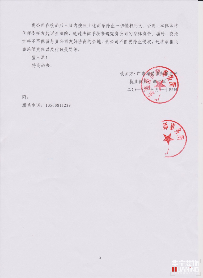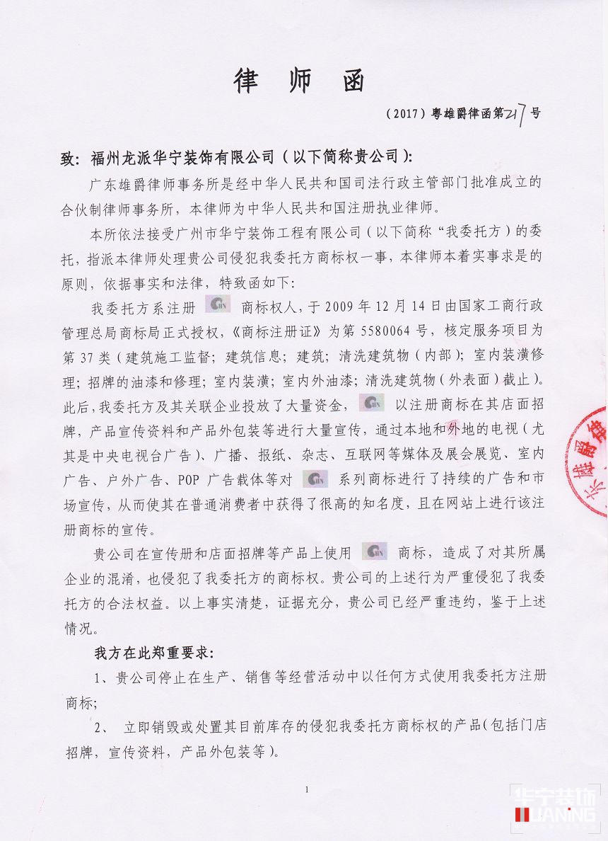 廣州市華寧裝飾工程有限公司是一家面向豪宅、樣板房、酒店、商業(yè)空間室內(nèi)外設(shè)計、施工、材料供應(yīng)及軟、硬裝提供系統(tǒng)化解決方案的全國大型裝飾連鎖公司,作為華寧裝飾圖形商標(第5580064號)的合法所有人,本公司名下的字號及商標均受到法律保護。
