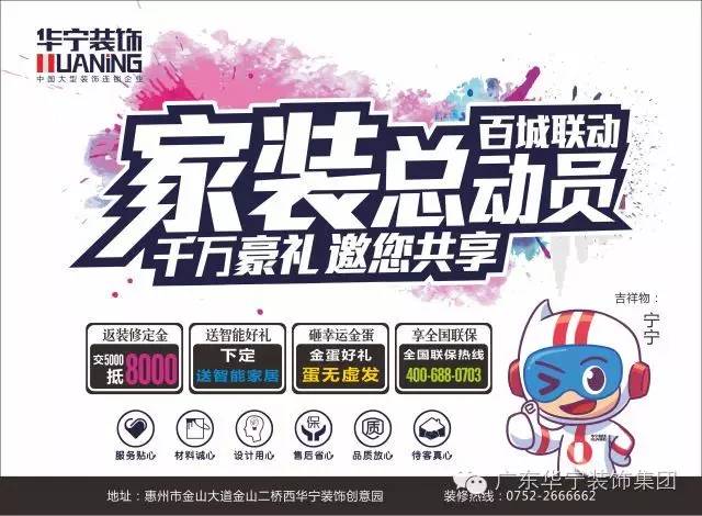 鉅惠! 2016年的夏季,沸騰的不只是炎炎烈日,華寧裝飾以“家裝總動員”為主題活動全面啟動,全國門店響應(yīng)聯(lián)動,讓您感受到席卷華夏大地的裝修熱潮;將給您帶來全新的家裝體驗,華寧鑄家,為您的家保駕護航!