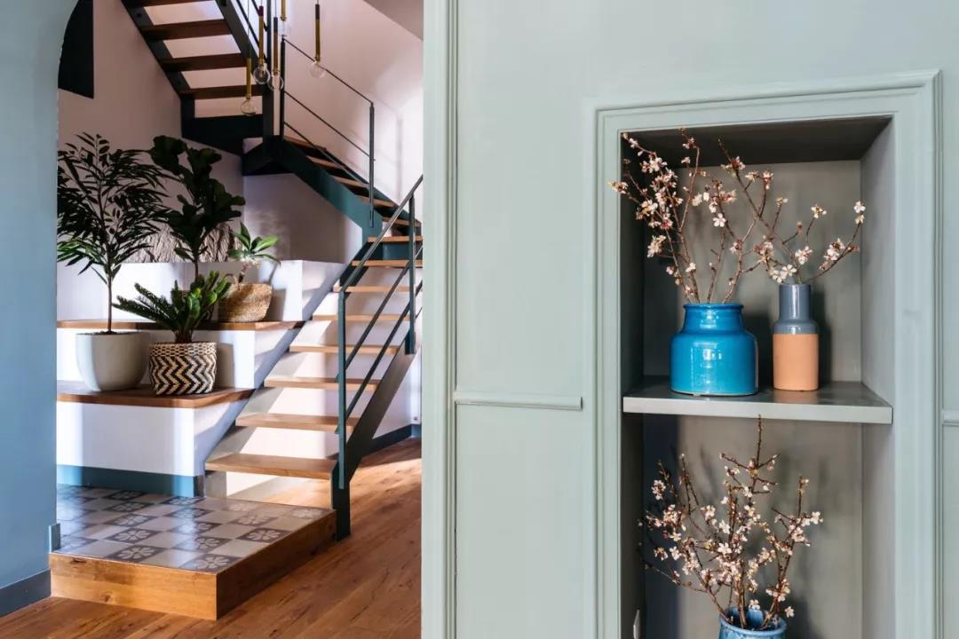 樓道間的墻面用了嬰兒藍(lán),這種顏色安寧溫馨?;ㄆ坎煌乃{(lán)色營造層次感,綠植和民族風(fēng)的地磚點(diǎn)綴十分好看。