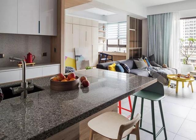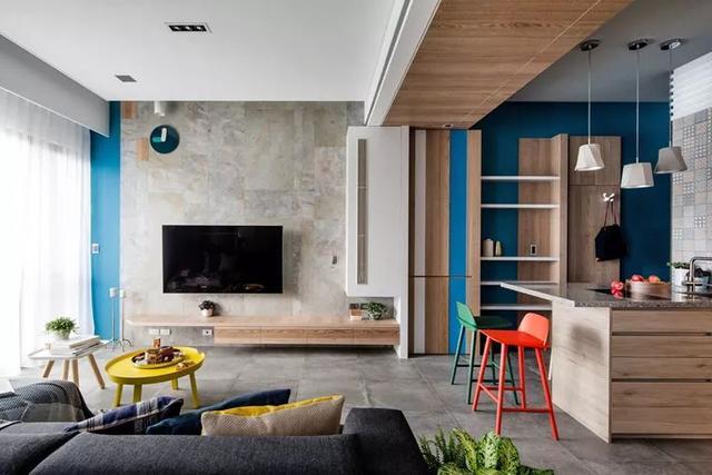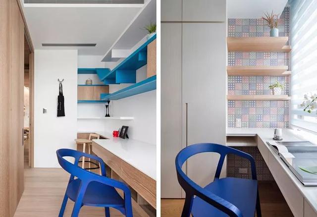 ▲原木+白色,搭配馬賽克瓷磚,文藝簡約,百葉窗簾柔和了光線,藍(lán)色的書架、椅子,抓人眼球,實(shí)為點(diǎn)睛之筆。
